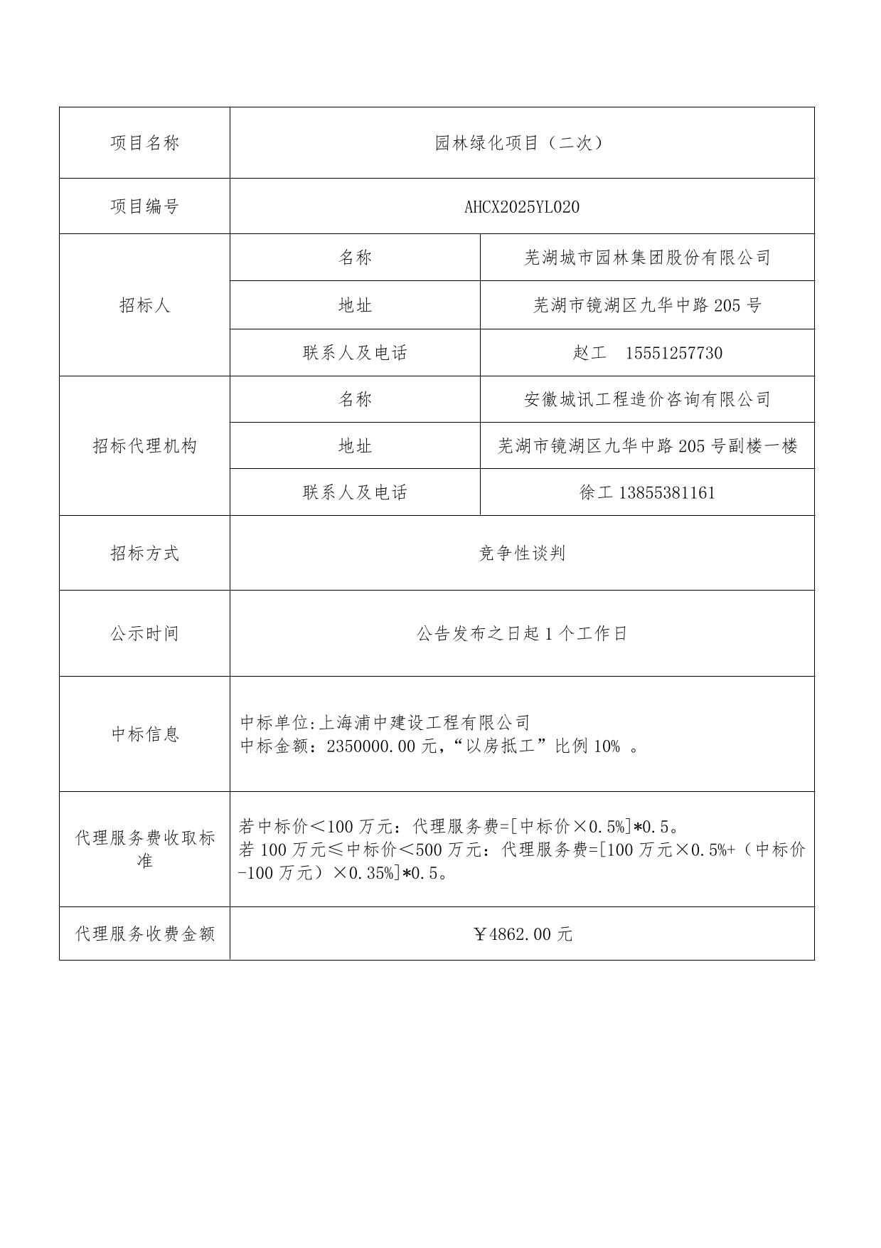 園林綠化項目(二次)成交結果公告