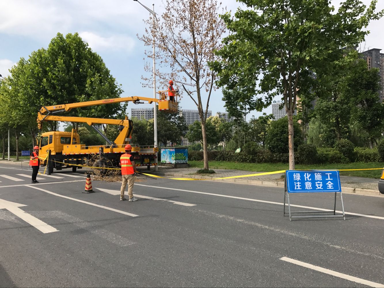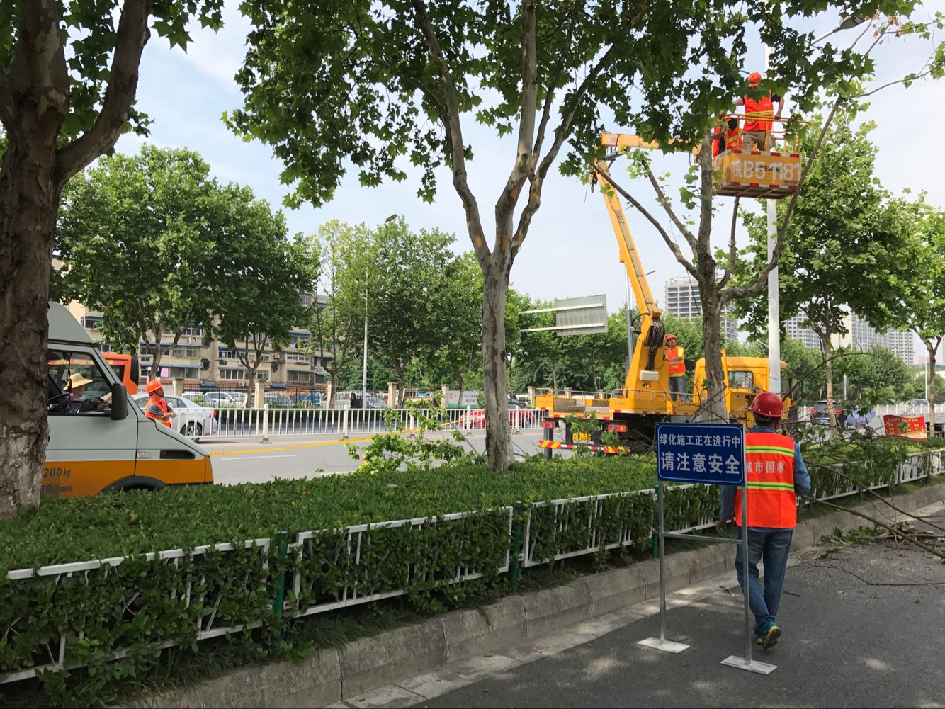 6月8號下午,我公司搶險小組一行人在公司領(lǐng)導(dǎo)的帶領(lǐng)下,來到黃山路與弋江路的管轄路段,對于道路兩側(cè)的行道樹進行排查。針對存在安全隱患的行道樹,我公司搶險小組的成員按照既定的安全應(yīng)急預(yù)案,身著反光背心,佩戴安全帽,在作業(yè)現(xiàn)場周圍設(shè)置安全警示標(biāo)識;并利用高架車、油鋸等車輛和工具各司其職,清除行道樹上的枯枝、死枝、懸枝,消除安全隱患。