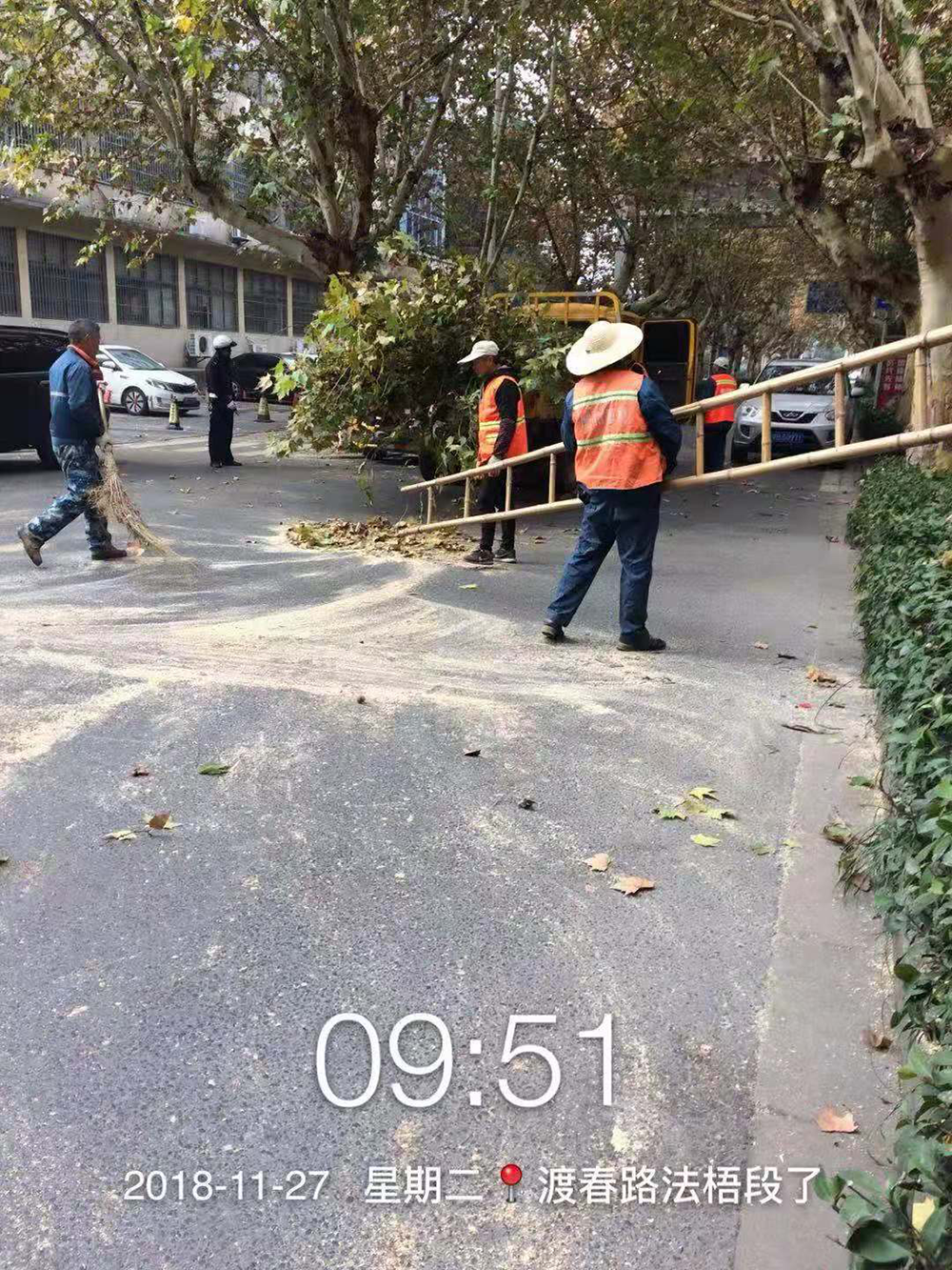 11月27日上午8時40分,渡春路上一棵有著多年歷史的高大法梧突然傾倒。上午9時左右接到110報警平臺電話,我們 當(dāng)時即組織20多位施工人員并調(diào)配3輛搶險車及時趕到出事現(xiàn)場。倒下的法梧樹已完全占據(jù)了機(jī)動車道,幸運的是沒有砸到任何人員和車輛。為減少對路面的阻擋,我們先鋸斷倒在機(jī)動車道上的法梧樹的枝干、樹樁,然后依次裝到搶險車上運走。鏡湖交警大隊八中隊的交警們維持秩序,引導(dǎo)車輛從道路南側(cè)繞行。經(jīng)過半小時搶險,道路已經(jīng)暢通了。