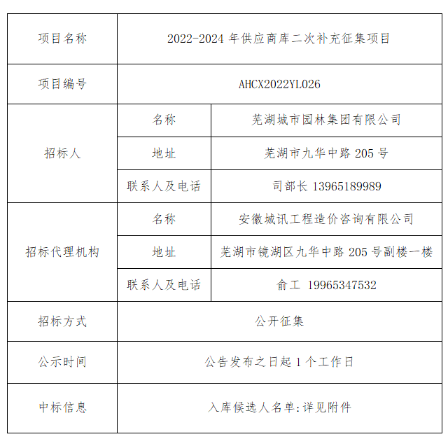 2022-2024年供應(yīng)商庫二次補充征集項目中標結(jié)果公告