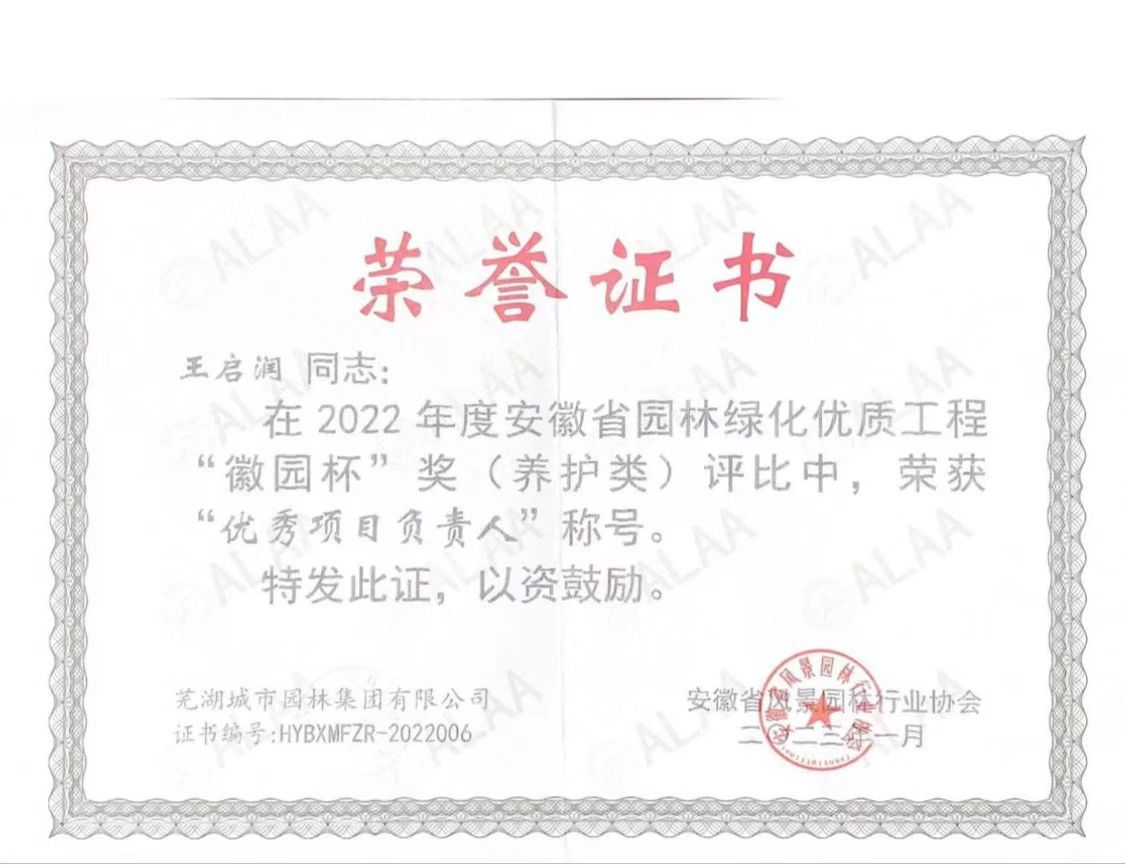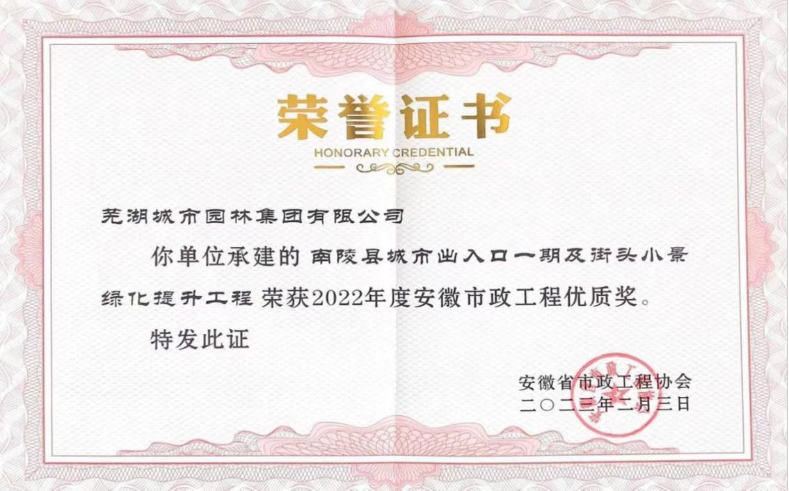 近日,蕪湖城市園林集團(tuán)承建的夢(mèng)溪路站周邊道路品質(zhì)提升工程項(xiàng)目、南陵縣城市出入口一期及街頭小景綠化提升工程,榮獲“2022年度安徽省市政工程優(yōu)質(zhì)獎(jiǎng)”;承接的蕪湖市市管公園養(yǎng)護(hù)工程喜獲安徽省園林綠化優(yōu)質(zhì)工程“徽?qǐng)@杯”養(yǎng)護(hù)類金獎(jiǎng),王啟潤(rùn)同志榮獲“優(yōu)秀項(xiàng)目負(fù)責(zé)人”稱號(hào)。