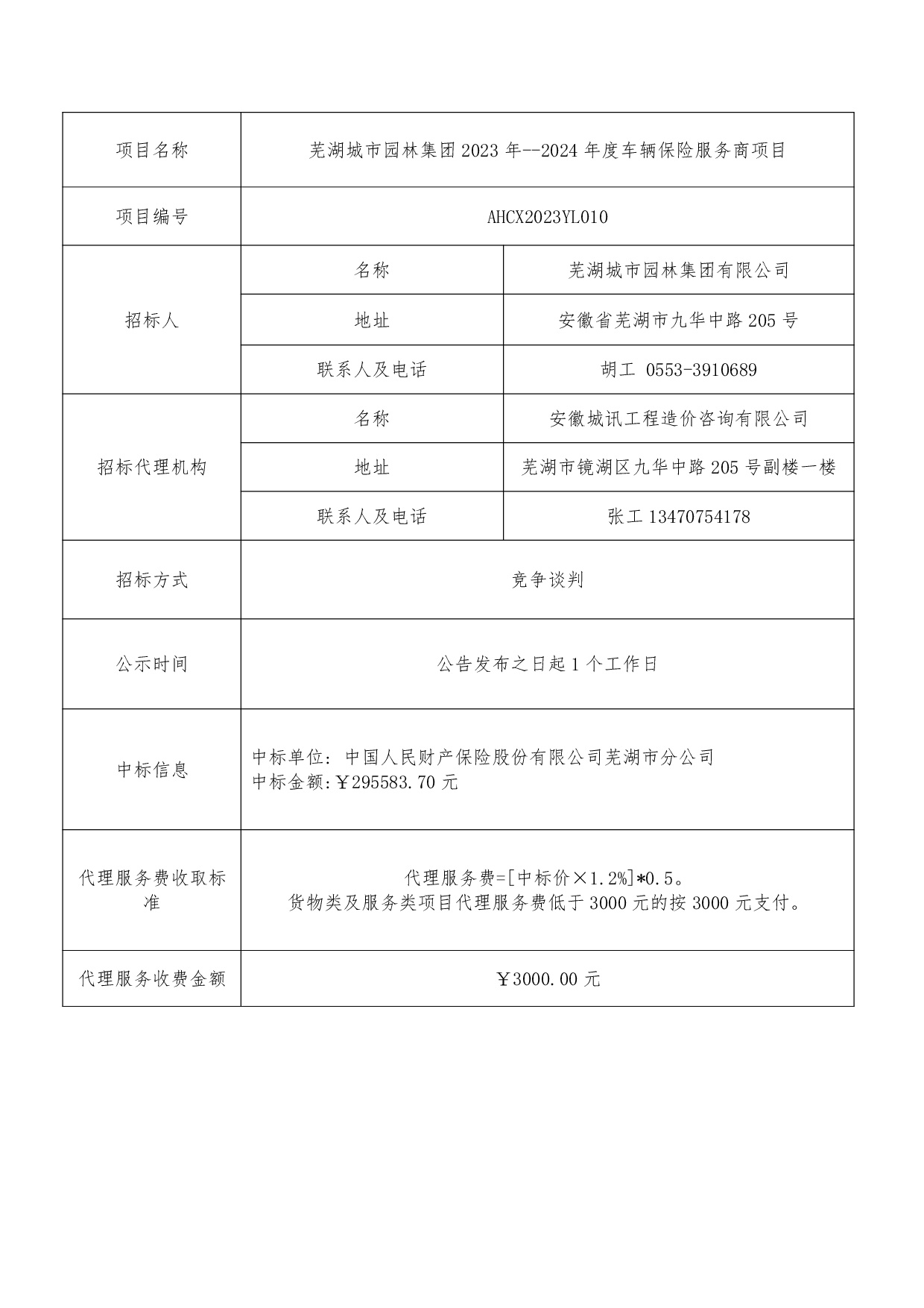 蕪湖城市園林集團(tuán)2023年--2024年度車輛保險(xiǎn)服務(wù)商項(xiàng)目中標(biāo)結(jié)果公示