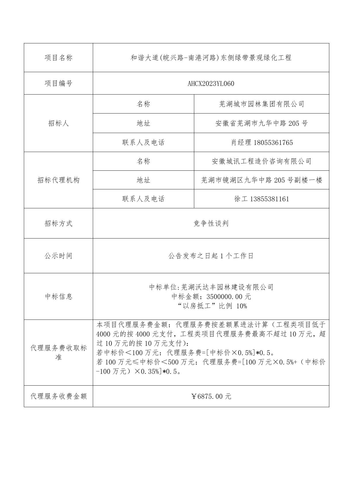 和諧大道(皖興路-南港河路)東側(cè)綠帶景觀綠化工程中標(biāo)結(jié)果公示