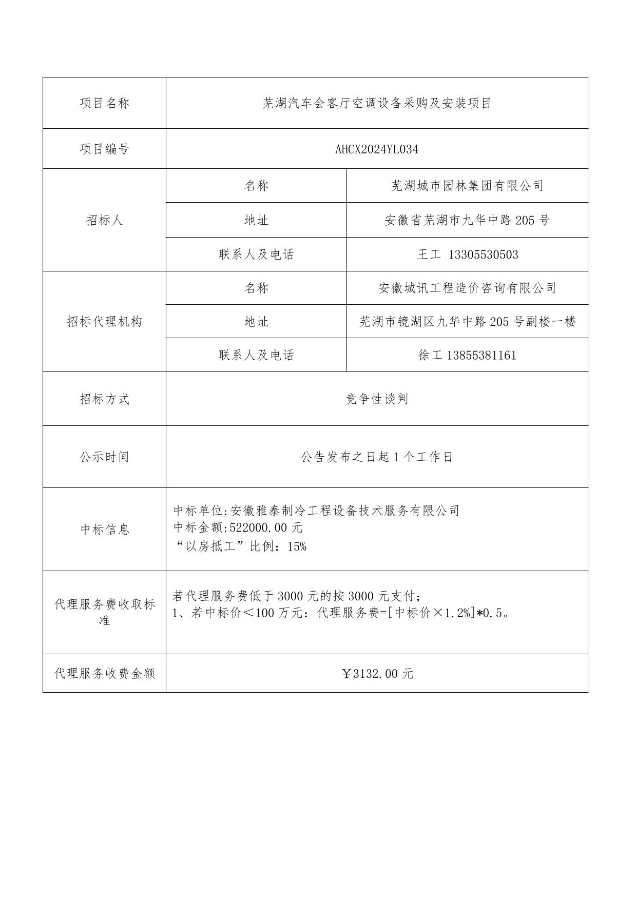 蕪湖汽車會(huì)客廳空調(diào)設(shè)備采購及安裝項(xiàng)目中標(biāo)結(jié)果公告